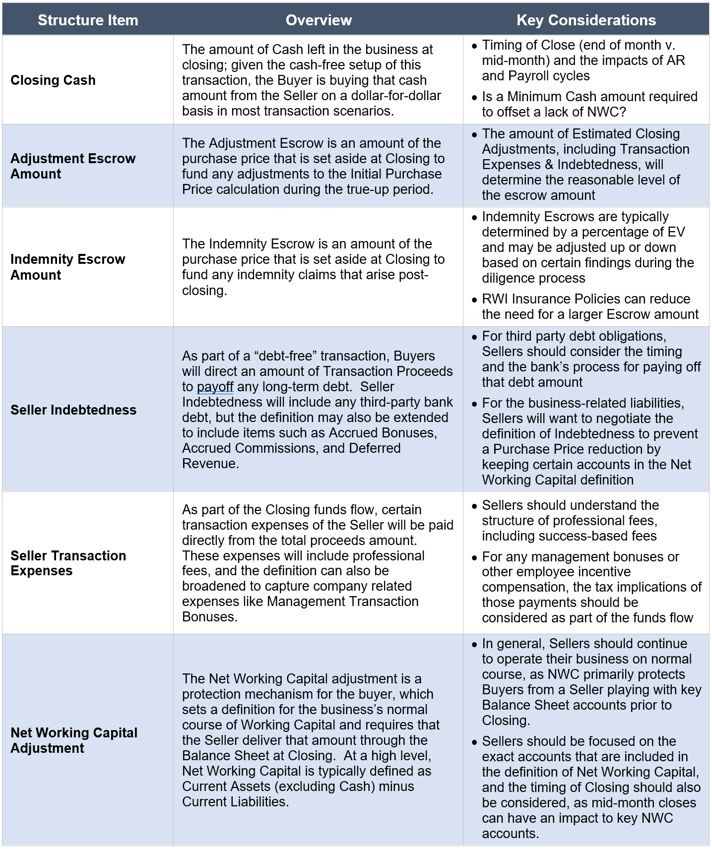 In the chart below, we have highlighted several of the common closing adjustments and some key considerations when thinking through how each will impact the Net Proceeds amount.